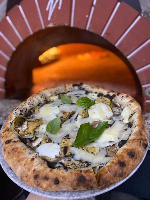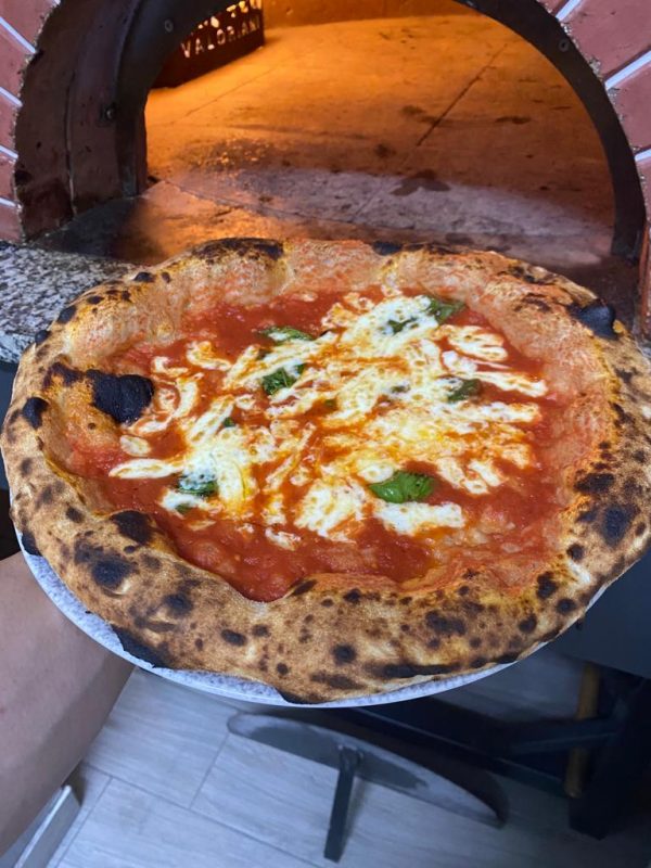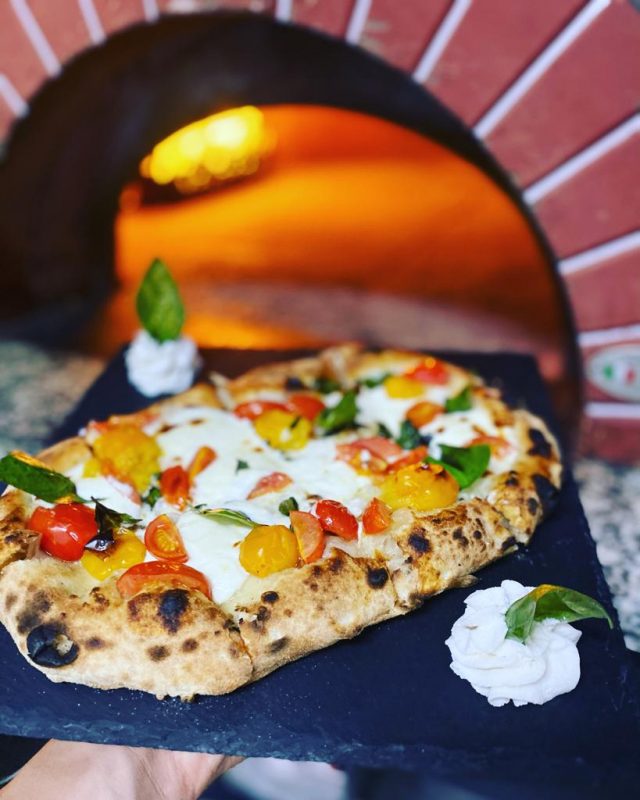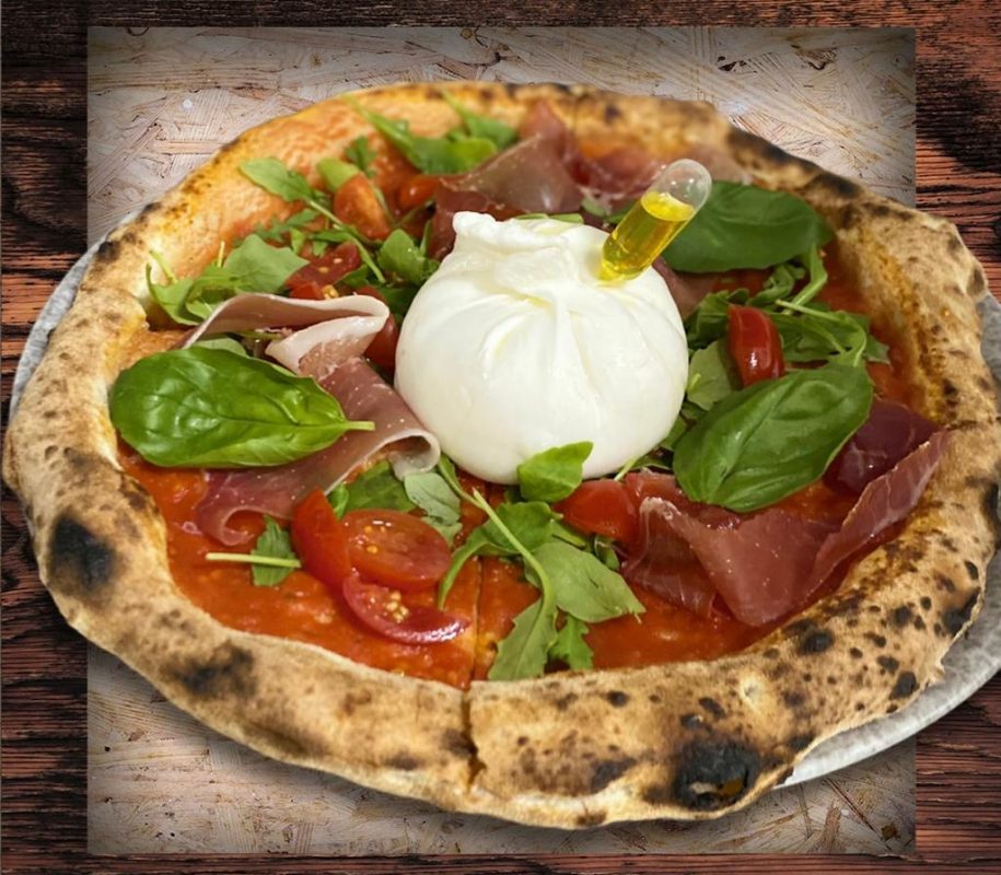 Pizzutello tomato sauce, fior di latte mozzarella, Taggiasca olives IGP, stracciatella cheese, Cetara anchovies, lemon zest